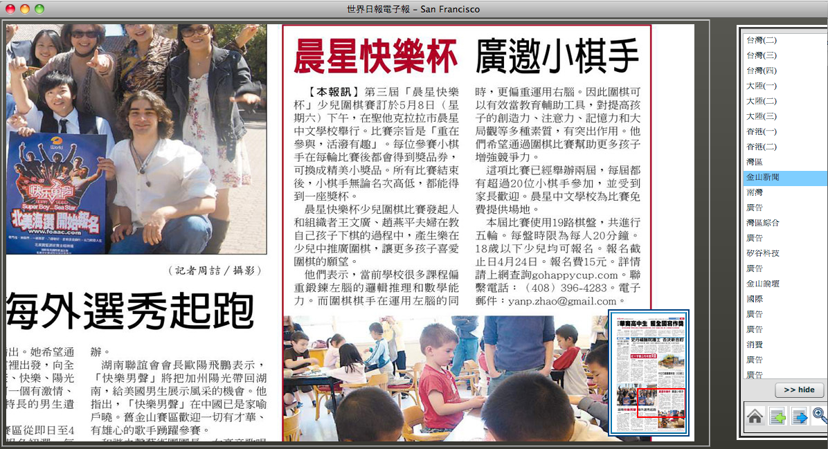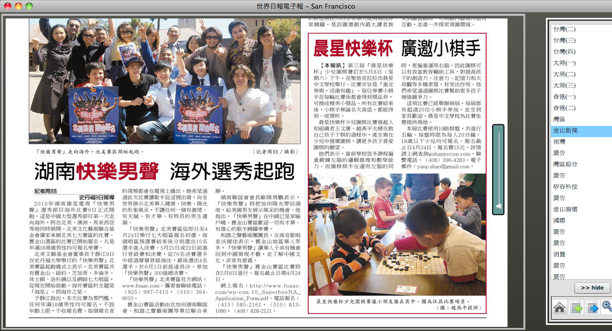 On April 10, 2010, World Journal page B2 published an article about the tournament. Here is the epaper version: